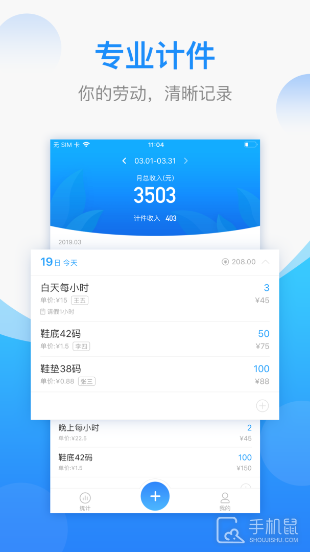 3、统计功能:靓丽的统计页面,用户可以通过饼图了解自己的收入分布。想知道自己每日每月的收入情况,统计功能可以一目了然,对自己的收入了如指掌,也不用担心单位算错记错的情况,让自己的每一分汗水和努力都能得到回报。