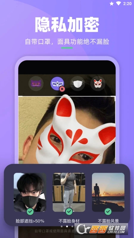 -智能审核隐私加密:采用AI智能+客服双重审核,绝对保障用户隐私的加密,针对于特殊病圈子个人照片、视频都不能露脸,所以我们自带有佩戴面具和口罩的功能