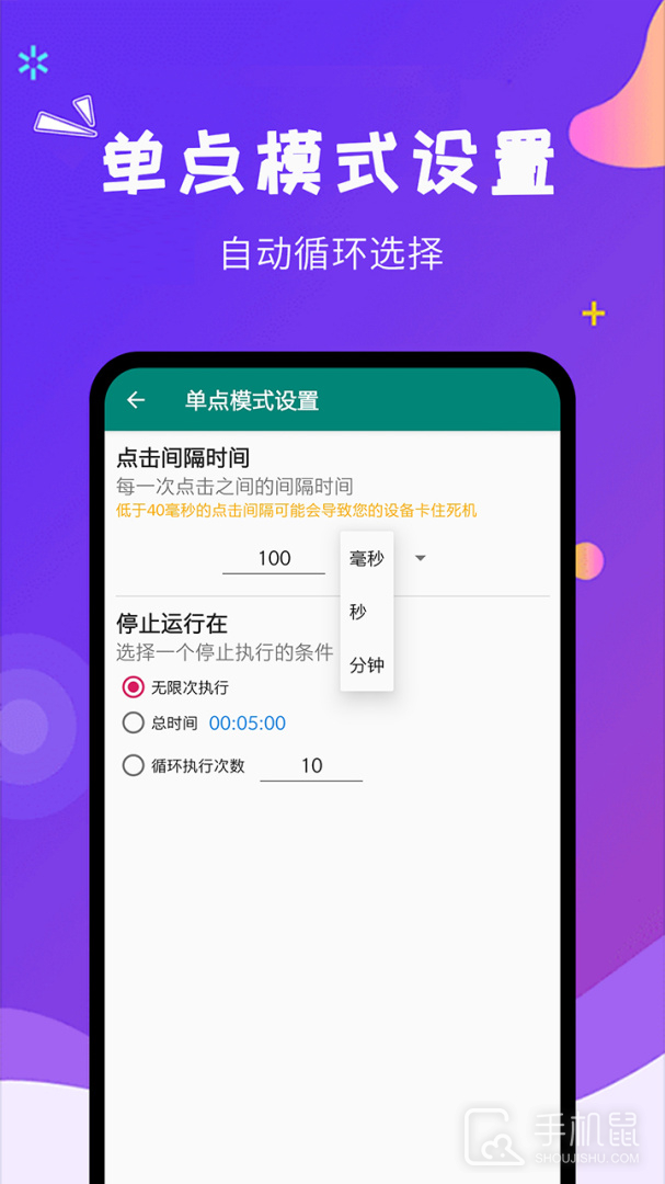 3、设置是点击模式的时间间隔,在线选择时间间隔和停止运行的时间