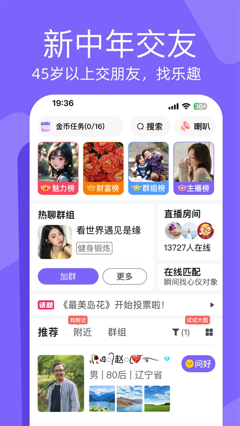 1、闲趣岛:新中年人的生活兴趣平台,结交同城兴趣好友,千人兴趣群,展示自我,和更多志同道合的人交流,让退休生活不在孤单。