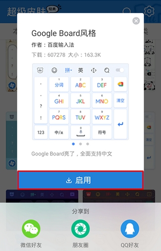 3、点击之后,输入法就会联网打开超级皮肤的页面。在这个页面中,我们可以滚动屏幕,慢慢查找自己所喜欢的皮肤。
