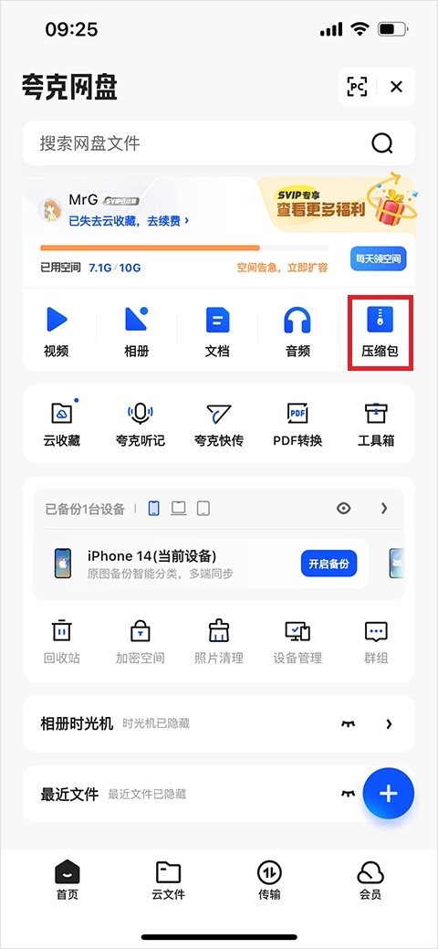 2、进入到夸克网盘内,再点击页面上方的“压缩包”选项;