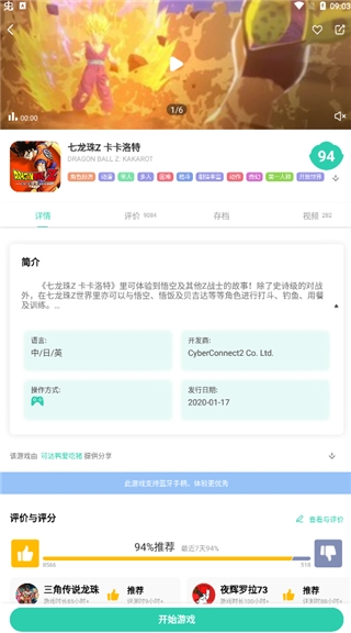 3、这里以七龙珠Z卡卡洛特为例子,点击进入可以看见游戏的简介,以及该游戏相关信息;