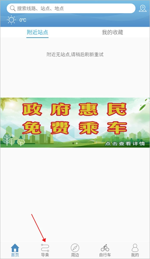 1、进入app后,首页会显示附近站点的公交信息,点击导乘;