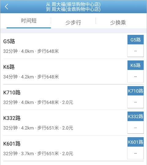 4、查询到的路线按照时间短、少步行和少换乘分类,再选择自己合适的路线出发即可。