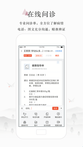 高效维护新老患者、图文语音咨询、线上复诊、开具处方、舌像AI识别、预约挂号;