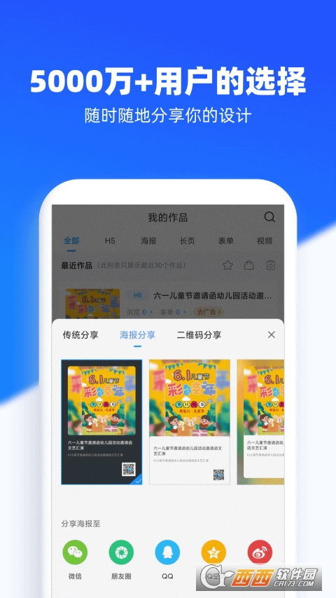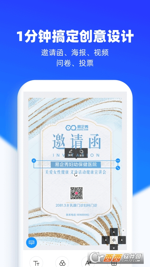 易企秀设计app是一款免费的移动场景自营销管家工具,这款易企秀设计app可以帮你免费制作各类手机h5营销类应用,另外这款易企秀设计app还可以帮你查看手机网页的访问量、潜在客户报名量,另外,我们允许用户通过客户端内置的分享功能,将手机页面分享到社交网络、邮箱、短信联系人,查看手机页面收集到的潜在客户联系方式,并可以直接拨打潜在客户的电话号码。