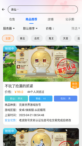 寻宝网交易app最新版本是一款由北京寻宝天行网络技术有限公司研发的游戏账号交易平台,有着不少热门手机游戏交易区域,其中包含了诛仙,梦幻新诛仙,王者荣耀,诛仙3,原神,完美世界等等,从中可以按照价格和游戏商品描述寻找账号,闲置账号还可以挂上去出售,非常方便。