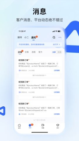 支持接收交易信息、平台动态、店铺动态、违规信息等一手信息