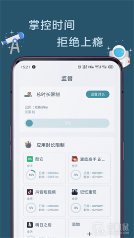 远离手机app致力于帮助人们减少手机使用。在现代社会中,我们对手机的依赖越来越高,许多人花费大量时间在社交媒体、游戏和其他虚拟世界中。然而,这种过度使用手机可能导致注意力分散、睡眠质量下降和社交关系紧张等问题。远离手机app采用了一系列创新的方法来帮助用户减少对手机的依赖。它可设置自定义的使用限制和提醒,帮助用户建立合理的手机使用习惯。它还有专注模式,可以暂时屏蔽所有通知,让你可以专心完成重要任务。通过设定目标和挑战,远离手机能够激励用户逐步减少手机使用的时间。通过远离手机app您可以更好地管理自己的时间,提高工作效率,改善社交关系并提升生活质量。不再被手机束缚,重获自由与平衡。让远离手机成为您摆脱手机依赖的良师益友,开始远离手机,走向更健康、全面发展的人生。