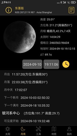 日食、月食、流星雨事件工具,曝光、DOF、星轨等摄影相关工具,以及晴天钟、光污染地图工具。