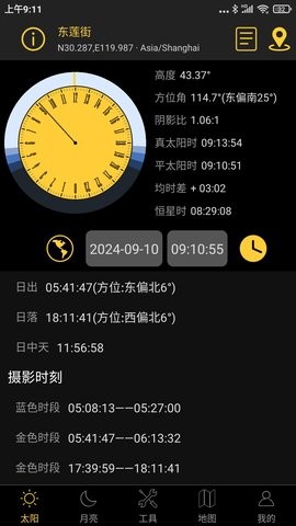 日出日落月相app可以为您计算太阳和月亮的准确位置,如果您喜欢拍日出、日落,或者是晚上的圆月、弯月,该软件可以帮您找到最合适的拍摄地点,该软件对于天文爱好者来说也是非常实用的,它还可以实时显示日出的详细信息以及摄影时刻哦~