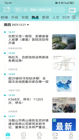 安徽视讯app安卓版是一款专门为安徽省本地居民们打造的生活动态新闻资讯平台,它里面记录了当地的各种新闻事件和热点,其中包含了军事,社会,娱乐,政治等等,可以让用户们了解到更多当地情况,同时也可以足不出户的观察社会发展,感兴趣快来下载体验吧。