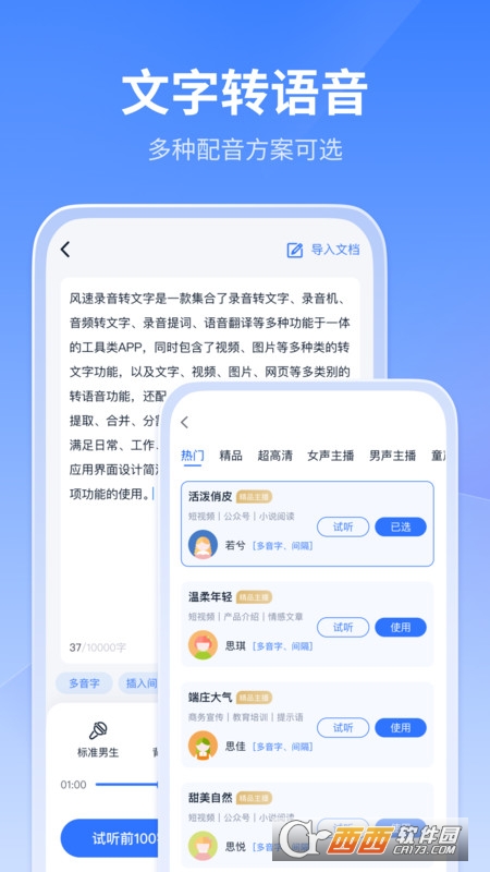 风速录音转文字是一款用于将语音内容转化为文字内容的专业工具,您可以选择自己录制的语音或者直接存入录音内容,应用将对音频内容进行实时分析,梳理出完整的文本内容供导出或编辑使用。同时产品还具备了多种实用功能,如文字配音、录音提词、语音翻译、音频处理和音频格式转换等。