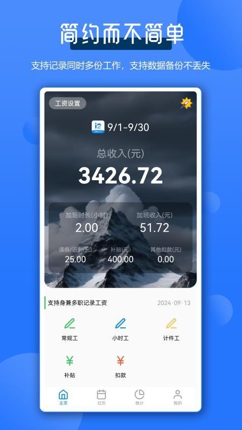 3、支持自动计算工资,只需输入相关数据,如基本工资、加班费率等,即可自动得出当月总收入,让复杂的工资计算变得简单。