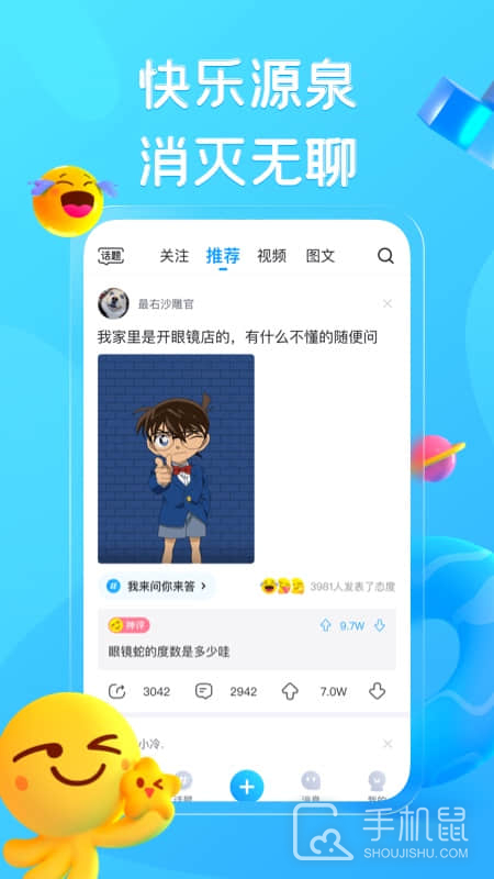 1、形式多样10000000+ 文字、视频、图片 任你选择。超火爆的神帖、超搞笑的GIF图,笑到腹肌长粗来