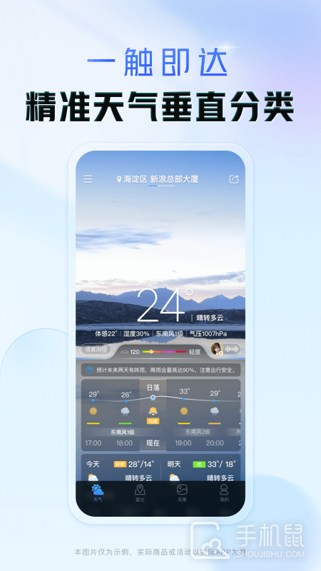 - 逐小时精细预报:可视化展示24/360小时级天气数据,风云变幻一目了然。
