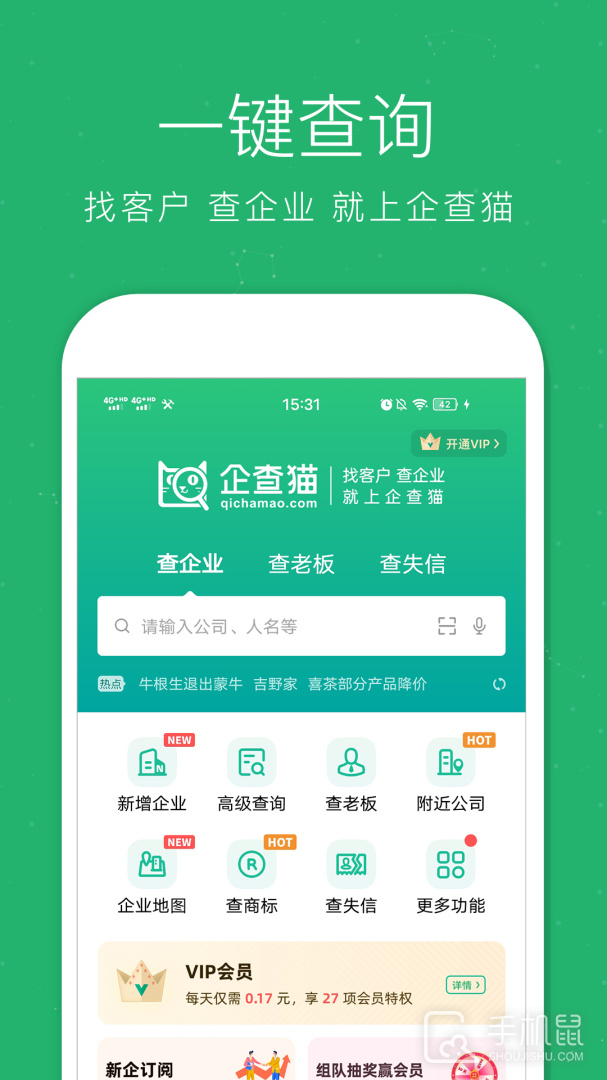 企业查询:支持企业名或人名等关键字的智能搜索,可一键查企业、查老板。