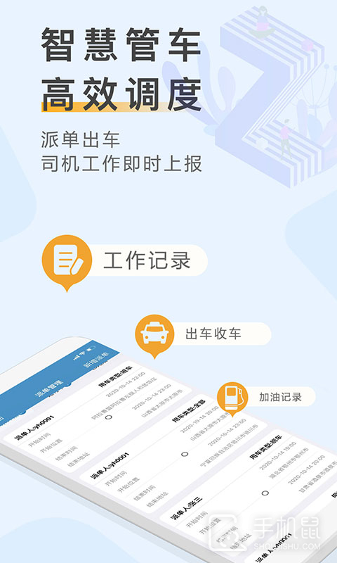 出车/收车、工作情况记录上报,方便调度;车辆位置轨迹、电子围栏、怠速情况、异常出车、排班派单、自定义标记等数据进行考核。