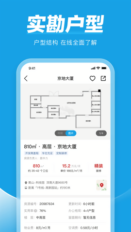 安排办公体验师,深入体验每套办公房源,并安排专业摄影师,拍摄专业实景图、及360度室内全景图。致力于为用户呈现详细、完美的室内细节,让线上虚拟看房,从此成为现实!新增地图找房、一键预约看房、主题精选房源等功能,给用户更好的找房体验!通过室内全景,街景、地图等,即可查看写字楼详情及周边,足不出户即可了解楼盘及房源信息。