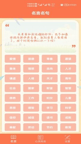 名言名句大全软件中有海量的天才名言、心灵鸡汤和名言名句,不仅可以为您积累作文素材,积累好词好句,而且古今中外的格言全都有,让您在闲暇时刻能够感悟人生的道理,名言名句还为您分成各种类型,不论是青春、信仰、儿童还是教育,您都可以在这里收集到好的句子。