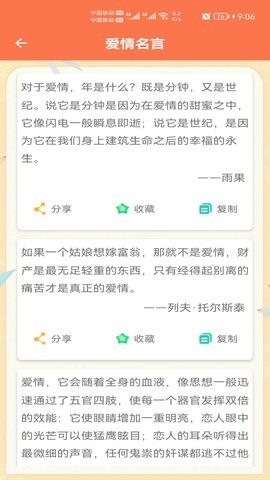 4、收藏和分享功能:用户可以收藏自己喜欢的名言名句,方便以后查看。同时,用户还可以将名言名句分享给朋友或家人,让更多的人获取优美的名言或格言。