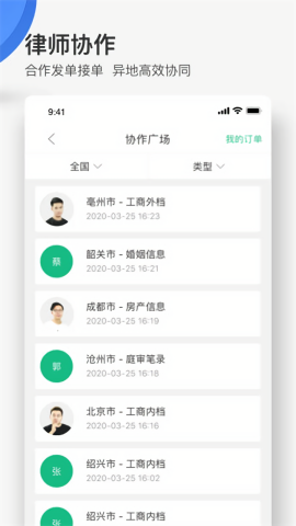 通过平台在线发单、接单,帮助寻找靠谱律师合作,高效解决异地查档、案件协作、案件代理等问题。
