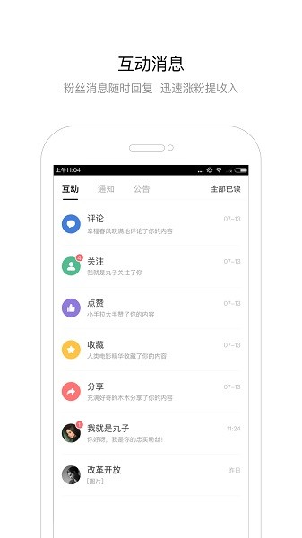 5、粉丝消息:评论,关注,点赞,收藏,分享,即时触达,第一时间了解粉丝动向