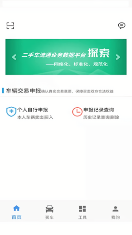 1、打开二手车流通app,首页可以进行车辆买卖申报;