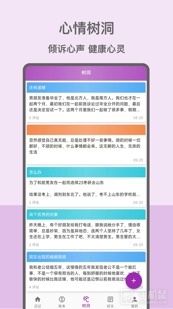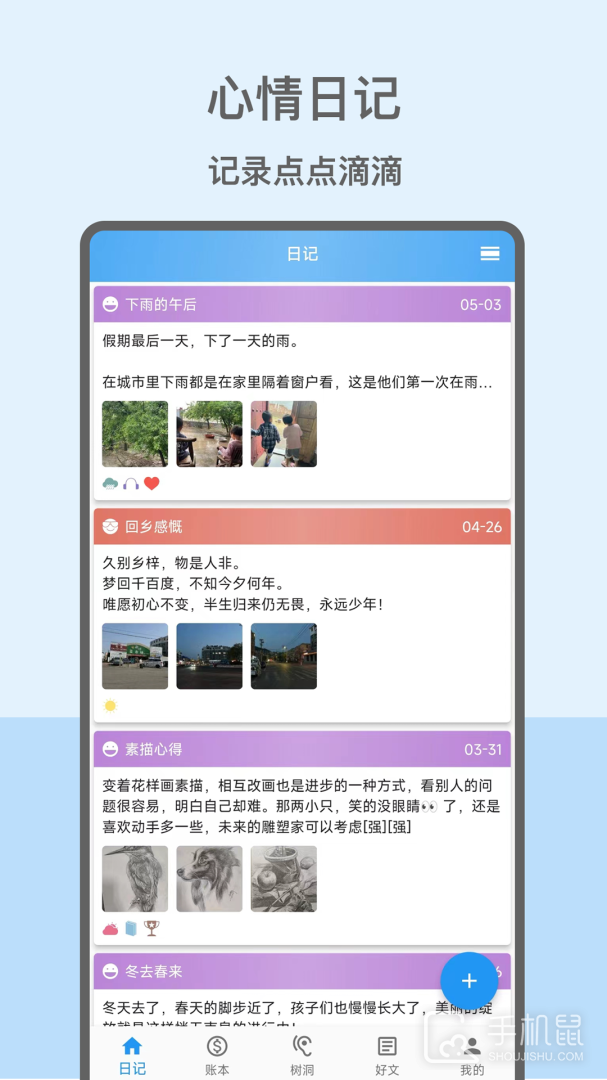 3、每日记账,让你的生活收支一目了然,心情树洞,分享你的快乐、喜悦、悲伤、难过,感受人生百态