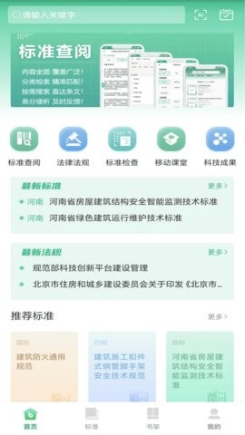 建设标准通app可以帮助您查询各种房屋建筑标准,首页会有最新标准和最新法规为您推送,您可以查看更多的标准公告,通过搜索关键字还可以查询到相关文章,文章上会显示发布日期和实施日期,也可以通过高级检索查询标准,还有行业资讯文章可以观看哦~