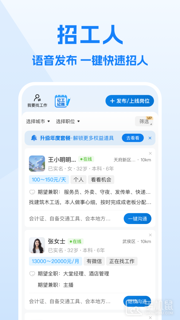 "工地招工"是一款专注于解决建筑行业招工难题的安卓应用,您是施工方还是想要找工作的工人,都可以通过该应用快速找到合适的工作或工人,用户只需发布自己的需求或简历,即可接收到符合条件的工作机会或工人信息,应用内设有实时聊天功能,方便双方沟通确定细节,并支持线上面试功能,应用提供了对工人信用记录的查看功能,帮助雇主更加全面地评估候选人,让"工地招工"app助力您轻松解决工地招聘难题,提高工程质量和效率。