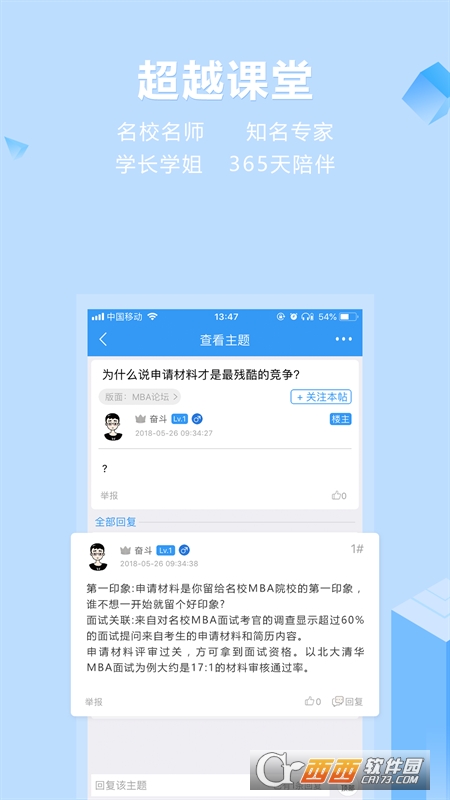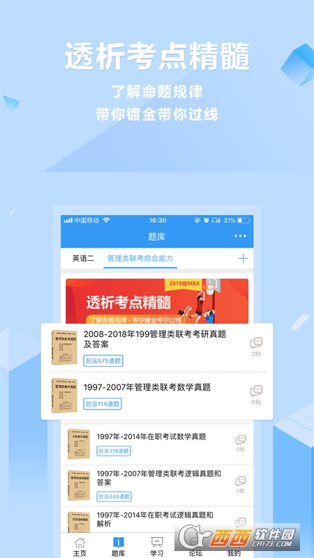 我们的app由MBA题库,MBA视频课程,MBA论坛,MBA日历,错题收藏,模拟考试,MBA资讯等组成,各个系统相辅相成助您高效的复习。