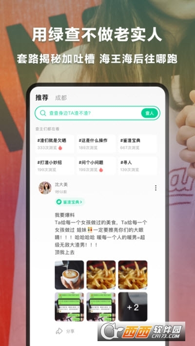 绿查app一个基于人际信用打造的便捷平台,在这里相互爆料,相互揭秘套路,渣男渣女无处遁形,还能和更多的朋友们分享交流避雷惊艳,为你的交往保驾护航,贴心守护!下载绿查app试一试吧!