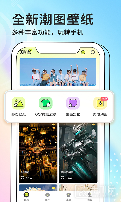 潮图壁纸是一款提供高品质、精选的个性化手机壁纸的应用程序,用户可以通过该应用程序浏览和下载各种热门的潮流壁纸,包括抽象艺术、城市景观、动物、明星等各种类型,满足用户对不同风格壁纸的需求。