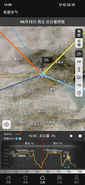 莉景天气app为您精准预测每日实况天气,包括每日温度、湿度、空气质量、紫外线强度等,您还可以看到日出和日落的预测时间,为您看风景提供了预测服务,还有未来的彩虹、云海、观星等特殊景观预测,您可以根据预测拍摄到奇美景色,轻松出片。