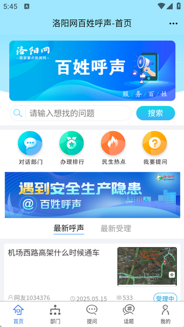 百姓呼声是一个为洛阳本地用户打造的软件,大家可以方便的通过app来进行查看本地新闻资讯,大家可以在线进行投诉建议,在这里大家可以对话各个部门,可以进行晚上投诉等等,让大家能够更好的问政,欢迎各位下载使用。