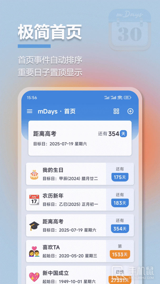 mDays倒数日是一款专门帮助用户倒数重要日期的应用,它可以帮助您计算距离生日、节日、考试、旅行或其他重要事件还有多少天,提醒您不要错过任何重要日子,无论是个人使用还是商业用途,都能提供非常实用的功能。
