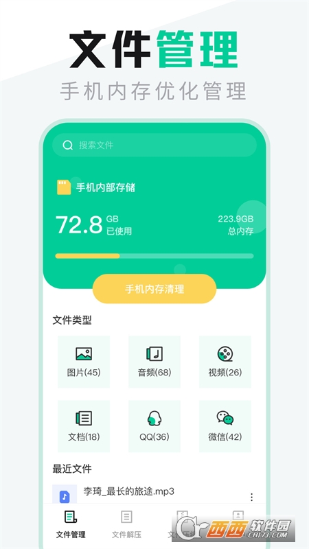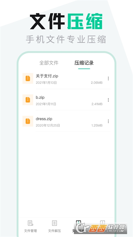 【智能的文件压缩功能】支持各类文件的压缩:手机图片、照片、音频、视频、文档都可一键进行压缩,可自动选择压缩的文件,修改压缩文件的名称,支持zip文件压缩格式。所有的压缩记录都可查看,方便修改