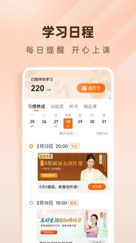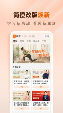 简橙app为您培养学习兴趣,让你多一门技能,多一门手艺,不论是书法、太极、瑜伽还是心理咨询课,这里全都可以学到,它为您提供超多精品课程、陪练和听书服务,还可以每天打卡记录学习时长,用户还能做任务获得橙果兑换书籍套餐哦~