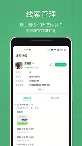 ●销售管理:线索导入;线索跟进;安排试听;签单购课;销售统计