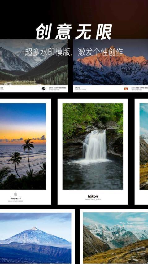 2、水印类型:水印不仅限于简单的文字和logo,还可以包括日期、地点、天气、心情等信息,甚至支持自定义水印。App还提供品牌水印,例如模拟各种相机品牌的水印。