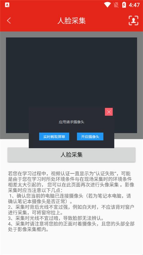 6、进行头像采集,需要注意的是头像采集时不能背光、头像需清晰。避免进入视频学习时“认证失败”影响学习,头像采集完成后点击进入培训班开始学习。