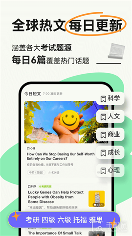 扇贝阅读app帮助用户提升英文阅读和理解能力,提供了丰富多样的英文文章、新闻、故事等阅读材料,并配有专业的字典翻译功能,让用户可以轻松阅读高品质的原版英语文章,扇贝阅读还采用了智能化的学习算法,根据用户的学习进度和水平,为其推荐个性化的阅读内容,帮助用户巩固知识、增加词汇量,用户还可以使用打卡机制来跟踪自己的学习进度,并参与社区活动和讨论,与其他英语学习者交流经验和建议。