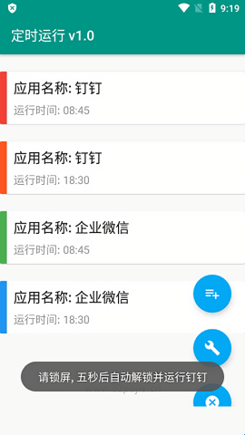 定时运行app安卓版是一款手机自动启动工具,它能够帮助用户自己启动手机内的软件和游戏,同时还可以直接解锁手机,只需要添加应用名称和运行时间即可开始,在此一直重复循环,能够为用户省去很多的时间,支持大部分手机使用,感兴趣的可以来看看。