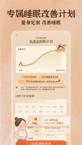 根据不同失眠原因,用心打造21天针对性睡眠计划。从失眠根源出发,结合美国医师学会认证的CBT-I,打造一套在家轻松执行的一线睡眠改善方案。
