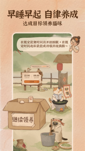 只需设定一个有挑战性的就寝、起床时间目标,每日达成你设置的目标,就可以在小院领养到可爱又治愈的流浪猫。