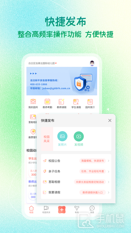 在首页中查看详细的校园动态内容,了解教职工签到情况,快速发布各种消息
