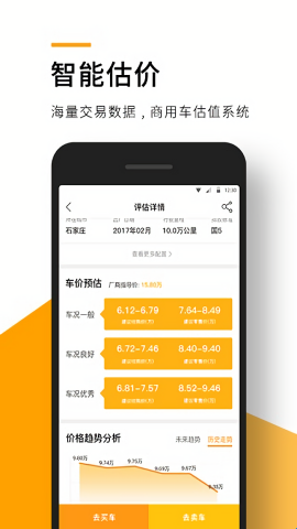 3、实时跟进市场行情动向,分析海量真实交易数据,基于交易大数据、价值计算引擎和残值数据算法的人工智能估价服务。