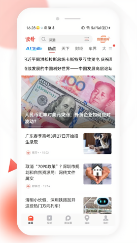读特客户端是一款新闻资讯服务平台,它是由深圳特区报社研发而成,里面提供了深圳地区和全球大量的新闻自诩内容,包含了商圈,财经,军事,社会发展等等,每天都会更新最新内容,同时还有多视频,直播,图文等三种方式播报,可以满足不同用户们的需求。
